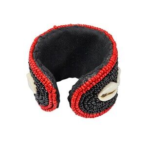 This striking handmade cuff bracelet features bold tribal-inspired design with vibrant red and black seed beads, accented with white cowrie shells and a turquoise mosaic centerpiece framed in gold and black beads. A true statement piece, this cuff combines bohemian and ethnic influences, making it perfect for festivals, cultural events, or adding an eye-catching accessory to everyday wear.