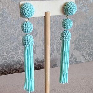 Beautiful light blue teal handmade beaded earrings. With nickel free post. About three inches in length.