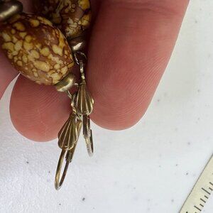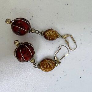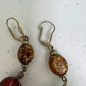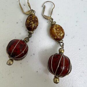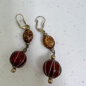 Handmade Beaded Earrings Red Brown Wire Wrapped Dangle Hook Gold Tone
