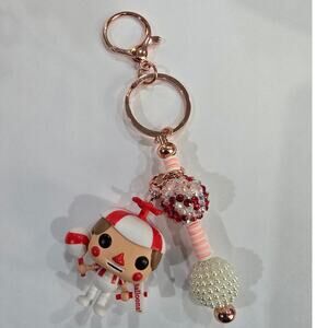 Handmade beaded keychain featuring a reworked mini vinyl figure and rose-gold-tone hardware. Fun, unique accessory that can be used as a keychain or bag charm.