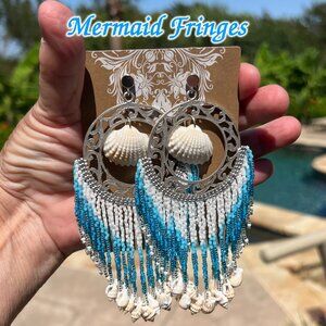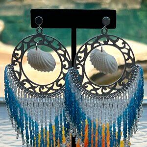 Handmade Beaded Large Long Tassel Fringe Dangle Drop Mermaid Post Shell Earrings