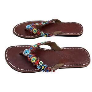 Handmade Beaded Leather Sandals Boho Size 9 Flip Flops Genuine Vera Pelle EU 40
