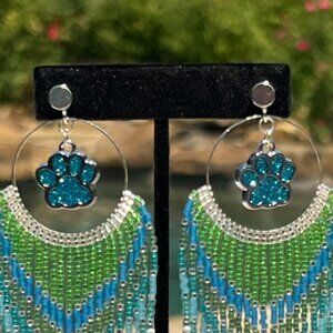 Handmade Beaded Long Fringe Paw Love Dangle Drop Lightweight Post Hoop Earrings