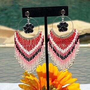Handmade Beaded Long Fringe Paw Love Dangle Drop Lightweight Post Hoop Earrings