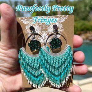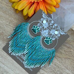 Handmade Beaded Long Fringe Paw Love Dangle Drop Lightweight Post Hoop Earrings