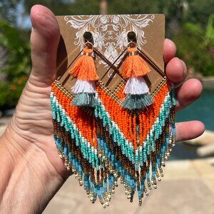 Check my other listings: seed bead earrings jewelry necklace ring Aztec style ethnic tribal indigo woven handmade hand beaded hand sewn tassel fringe fancy crystal bling big chunky boho bohemian statement stage dramatic funky fun young mixed look designer inspired fashion unique trendy trending light dark bold teal turquoise herringbone bridal wedding formal dress dressy casual vacation cruise tropical beach ocean party spring summer iridescent sparkle shimmer multicolor colorful mixed metals sale triangle hoop post large huge art artist artisan festival tribal ethnic fringe tassel dangle seed bead miyuki delica Indian southwest west western rustic Texas fashion head shot pageant prom runway diva artisan native American native American style long fringe shoulder dusters southwest Spanish Mexican Indian sexy hippie 70s fine vintage woman gift statement stone jewel jeweled large huge natural whimsical rhinestone faux diamond multi color free spirit birthday anniversary wedding gift