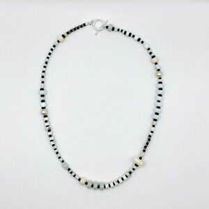 This thoughtfully designed necklace combines carefully selected vintage and contemporary beads to create a unique piece with character and charm. The sophisticated neutral palette of white, gray, off-white, and black beads creates a versatile accessory that pairs with any outfit. Small black seed beads throughout add visual rhythm and texture, while irregular baroque-style beads provide organic interest. The sterling silver toggle clasp provides both function and polish.