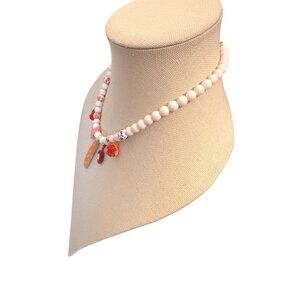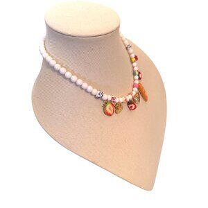 This handcrafted necklace combines white beads with colorful, detailed fruit-themed charms, creating a vibrant boho style. Elegant and unique for casual wear.