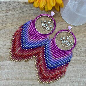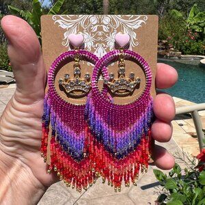 Handmade Beaded Queen Long Fringe Dangle Drop Lightweight Post Hoop Earrings Wow