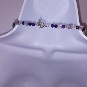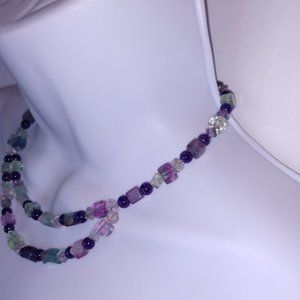 This unique hand crafted necklace is made with varying colors and shapes of frosted fluorite, beads , with purple amethyst beads in between. Necklace has silver toned toggle closure and silver toned accents. Necklace length = 16 inches. Reasonable offers gladly accepted. *ALL ITEMS FROM PET FRIENDLY/SMOKE FREE ENVIRONMENT.*