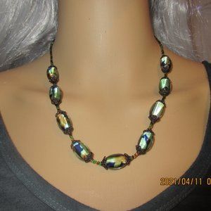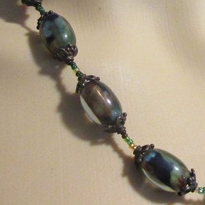 Handmade glass bead necklace with glass seed bead and filigree metal accents. Non adjustable. Very nice quality beads. Measures 18" open end to end.