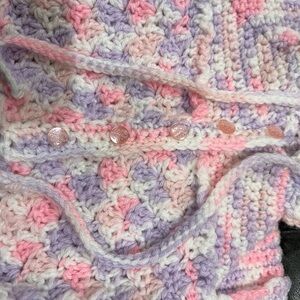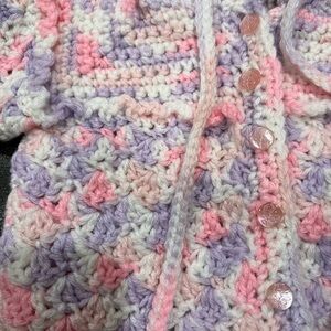 Handmade pastel pink and purple colors baby sweater coat cardigan. Beautifuly hand knit. Measurements in photos. Hooded, button up. Tie with hood.