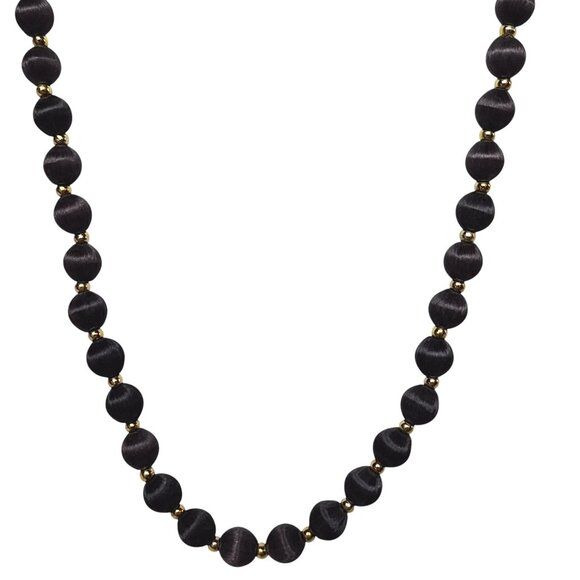 Handmade thread-wrapped black bead necklace with gold spacers.