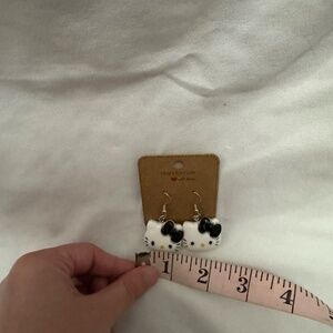 These are handmade by me Black Bow Hello Kitty Earrings. The Hello Kitty is a little over an inch high and a little over an inch wide. Please refer to photos for more accurate measurements and sizing. The earrings are made out of hypoallergenic iron and resin. They feature a rubber stopper on the back. Please refer to the video to see all of the beautiful details of these earrings.