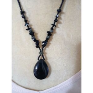 Stylish handmade necklace featuring a glossy black glass teardrop pendant suspended from a seed bead chain. The necklace includes black chip-style accent beads for a bold, textured look. Lightweight and versatile, this necklace is perfect for casual wear, bohemian style, or as a statement piece.