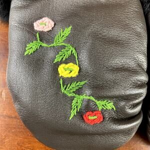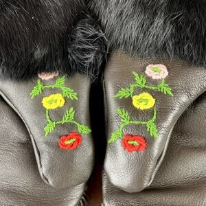 Stay warm and stylish with these unique handmade black leather mittens! Featuring a cozy fur trim and intricate hand-embroidered floral designs, these mittens are sure to make a statement. High quality leather and the softest fur ever. No size marking or band. Fit a size Small/Medium.