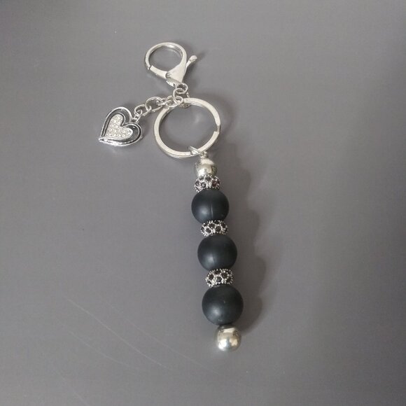 Handmade Black Silicone Beaded Keychain with Heart Charm