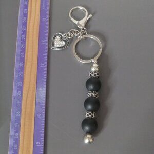 Features: Matte beads, silver spacer accents, lobster clasp, split keyring, dangling heart charm