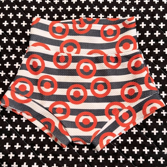 Black/white stripes w/ targets, high waisted and stretchy. No size tag, but fit 12-24 months. One small pull on fabric on back, see photo.