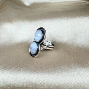 This artisan handmade silver ring features two polished round Blue Lace Agate gemstones, admired for their soft blue color and natural lace-like banding. Each gemstone is bezel set in sterling silver, creating a balanced and elegant double-stone design. With its calming hues and unique style, this ring is perfect for both everyday wear and special occasions.