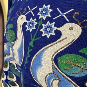 Handmade Blue Peacock Print Cotton Poncho Pullover Top with Tassels One Size
