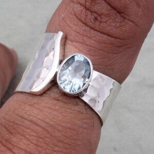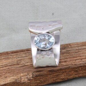 Handmade Blue Topaz Sterling Silver Ring - Hammered Band