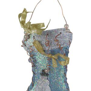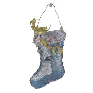 Add sparkle to your holiday display with this beautiful handmade blue glitter Christmas stocking ornament. This festive piece features a shimmering blue body, silver glitter cuff, dangling snowman charm, gold ribbon bows, and decorative copper wire stitching around the edges. white pearl like bead accents give it an extra wintery touch.