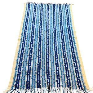 Handmade Blue & White Geometric Crochet Blanket With Fringes 43x74" Grannycore