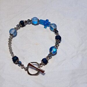 Handmade Blue and Silvertone Cross Bracelet 8.5"