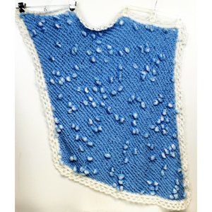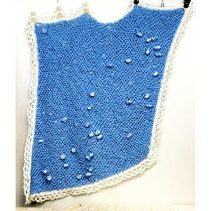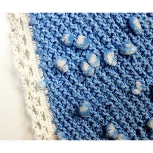 Handmade Blue and White Knitted Baby Blanket with Pompom Accents Super Soft