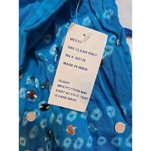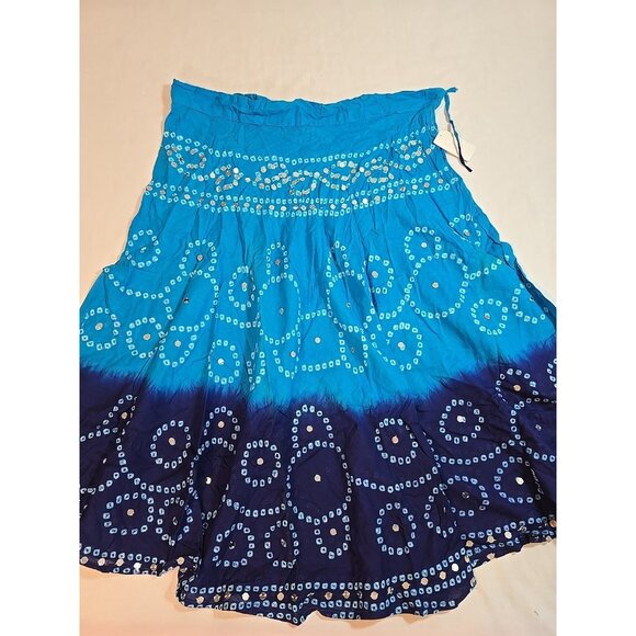 This handmade blue boho midi skirt by Meeto features adjustable tie waist and mirror sequins, making it perfect for a party or casual occasion. The ombre pattern and A-line style give it a festival, hippie, bohemian, and retro vibe. Made from lightweight rayon fabric, this one size skirt is ideal for summer and spring seasons. With a mid-rise and a skirt length of midi, this piece adds a touch of handmade charm to any wardrobe.