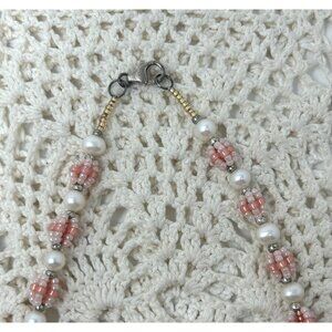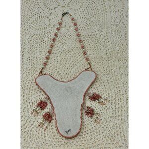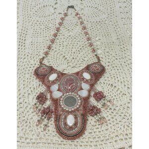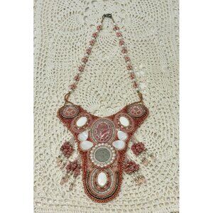 This exquisite handmade statement necklace embodies a rich blend of artistry and elegance. Adorned with pink and white beads, it showcases intricate beadwork that exudes a bohemian flair. The central design features a captivating arrangement of beads, lending a touch of sophistication to any ensemble. With its unique craftsmanship and vibrant hues, this necklace stands out as a striking piece, perfect for those who appreciate detailed and artistic jewelry. Its bold presence and delicate detailing make it a memorable accessory, enhancing any outfit with a touch of creative charm.