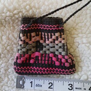 Woven pattern in shades of pink, grey, and black, and has a drawstring closure at the top.