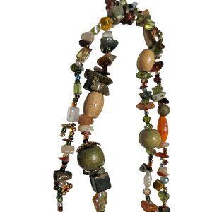 A versatile accessory combining natural wood, glass, and stone beads in varied shapes and earthy hues, enhancing your wardrobe with unique elegance.