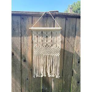 Bring warmth and texture to your home with this handmade macramé wall hanging. Crafted from soft cream cotton cord, this boho-style tapestry features intricate woven patterns and long fringe tassels for a natural, artisanal look. Hung on a wooden dowel with a sturdy cord, it’s the perfect accent for a living room, bedroom, nursery, or entryway.