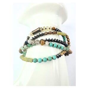 This preowned bracelet showcases a variety of beads that appear to include turquoise, hematite, quartz, citrine, agate, and possibly jasper, along with metallic and glass accents. The mix of textures and tones gives it a unique, boho-chic character that pairs well with casual or eclectic styles.