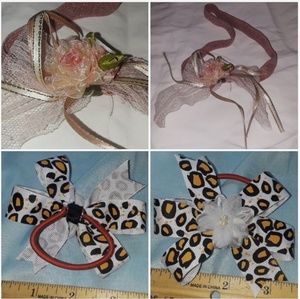 Handmade Hairbows Value Bundle: Floral headband, Leopard Ponytail Holder, Pastel Pink and purple flowers Barrette, 2 Hello Kitty alligator Clips Pink and Black. New.