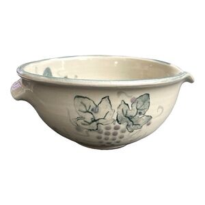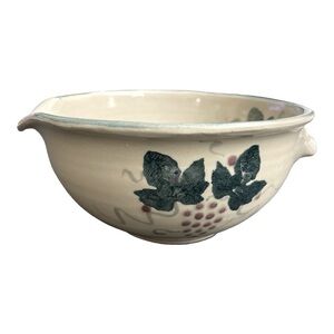 Handmade Bowl w/ Grape vines/ leaves. Singed by artist. Handle/ lip for pouring. Great bowl for beating eggs, pancake mixture, or for any kind of mixture. Beautiful bowl handmade and glazed by artist.