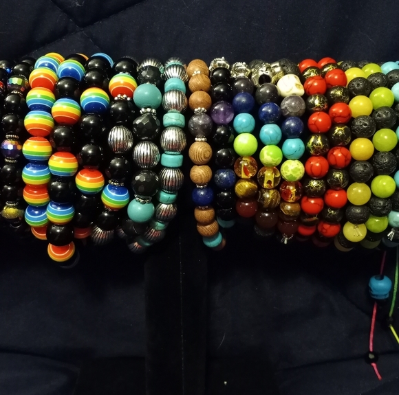 Most bracelets are made with genuine gemstones such as adventurine, jasper, rose quartz, or lapislazuli. Message me on facebook if interested in one of these or something else. I take color requests! Find me at Twisted Tragedies on Facebook! https://www.facebook.com/twistedtraged
