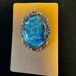 Handmade silver tone and glass cabochon brooch with one of a kind swirled paint skin with shades of lavender and silver flakes colors, measuring 2” x 1.5”.