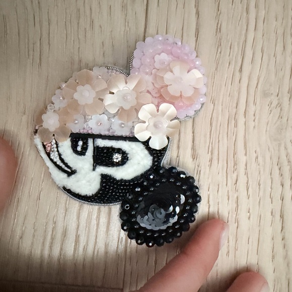 Elegant floral embellished brooch featuring black, white, and pink accents. Perfect for adding a touch of sophistication to any outfit.