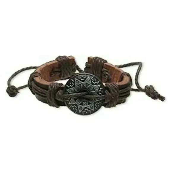 Handmade Brown Black Aztec Tribal Sun Leather Silver Pewter Adjustable Bracelet