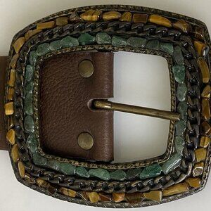 Rare Vintage Handmade Brown Leather Large Brass 3.5" Buckle Embellished Statement Belt Semi Precious Stones Studs Fits Up To Size 36. Brass Buckle. Width is 2" . Beautiful Condition!!! Too Many Details to Mention!!! Stones are probably Jadeite or Aventurine and Tigers Eye. Spectacular!