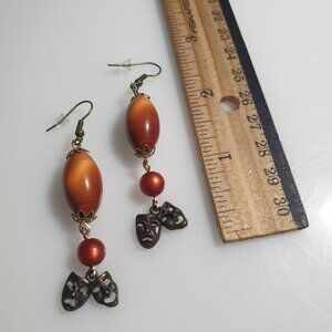 Beautifully crafted dangle earrings featuring theater-inspired comedy and tragedy mask charms. Warm-toned oval and round beads accented with antique brass findings for a unique artistic flair.