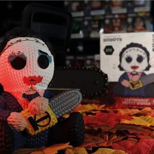 Unique horror character vinyl figure holding a chainsaw. Features a mix of colors including black, white, and red.