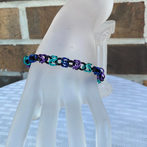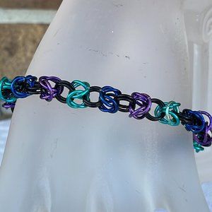 Handmade Byzantine Chainmail Bracelet. Colors are Black, Purple, Royal Blue, and Turquoise. Bracelet is 7 1/4 Inches Long. Handmade by Lotus Blossom Boutiques.