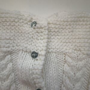 Welcome a little one with this gorgeous, cozy sweater! This beautiful garment is a true work of craftsmanship, featuring a timeless cable knit pattern in a soft cream/off-white yarn. The charming blue buttons (which appear silver/clear with a blue reflection) add a unique, handmade touch.