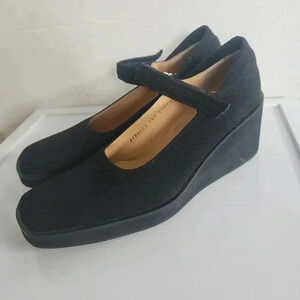 Beautiful pair of Handmade in Spain Cameo black Mary Jane wedge shoes. These heels are made of the highest quality materials. They are lightweight and very comfortable. The straps are fastened with a velcro, the interior is high quality leather, and the shoe is soft black fabric. These shoes do not have a listed size. The fit my daughter who is a size 7. They have a more narrow fit. The inside sole is 9.5" long x 2.75" wide. The wedge heel is 2.5" high.