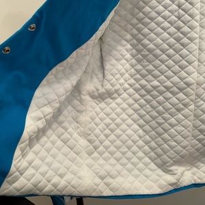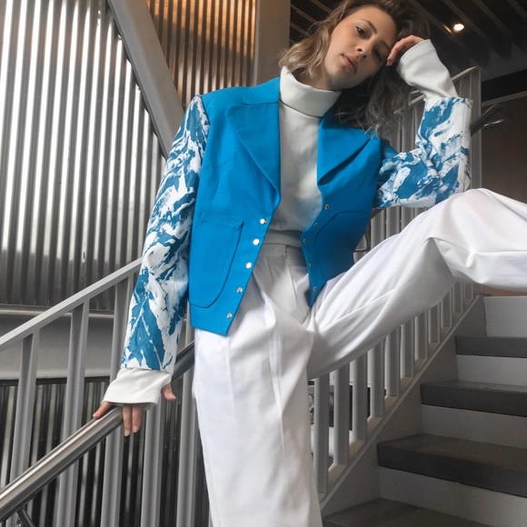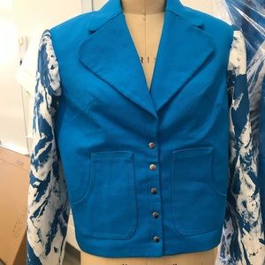 Handmade canvas jacket with shoulder pads sewn in. Textured white lining and 5 snaps on center front. The body is blue canvas with white/blue canvas sleeves. Also has two front patch pockets and a lapel