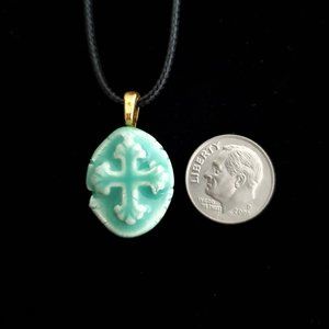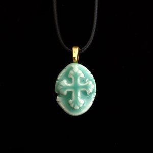 Handmade Ceramic Aqua Green Fleur De Lis Cross Pendant Necklace. The Pendant is a handmade ceramic Fleur De Lis Cross pendant in an aqua green glaze finish. It’s on a waxed cotton cord that measures 20” in length. It also comes with an extra 2” chain extender for length adjustment.
